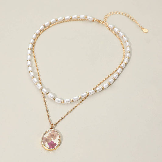 Floral Resin Pendant Pearl Metal Chain Layered Necklace