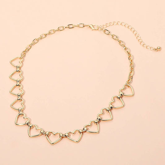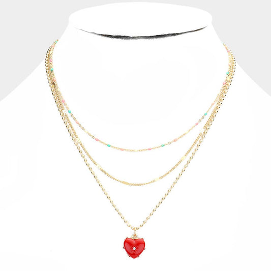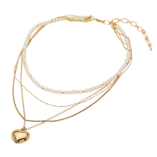 Puffy Metal Heart Pendant Accent Pearl Beaded Multi Chain Layered Necklace
