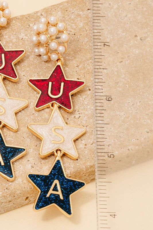 4Th Of July Usa Stars And Pearls Dangle Earrings