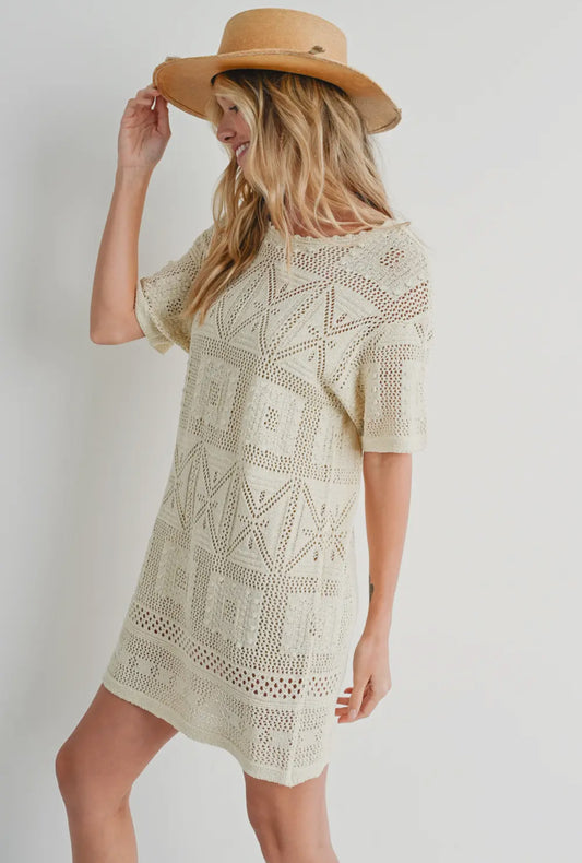 Stripe Frilly Split Neck Shirred Ruffle Sleeve Short Dress