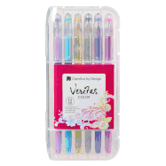 This assorted set of 12 non-toxic gel pens is perfect for anyone whether they enjoy coloring, sketching, doodling, scrapbooking or journaling. Each vibrant metallic and glitter gel pen have either a 0.8 or a 1.0 mm diamond tip for smooth application to any type of paper.