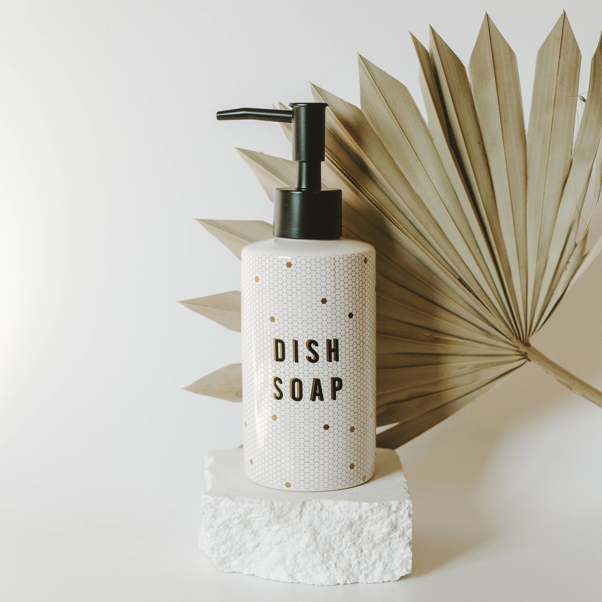 DETAILS: • 8.5 oz Ceramic Dispenser • White and Gold Honeycomb Design • Black Text with Gold Detail Reads "Hand Soap" •
