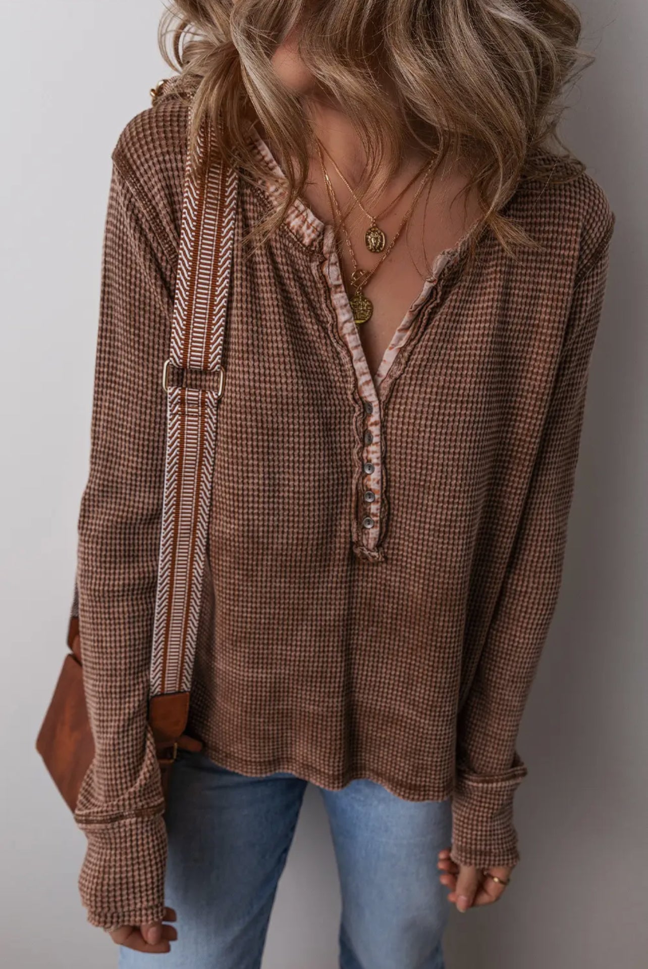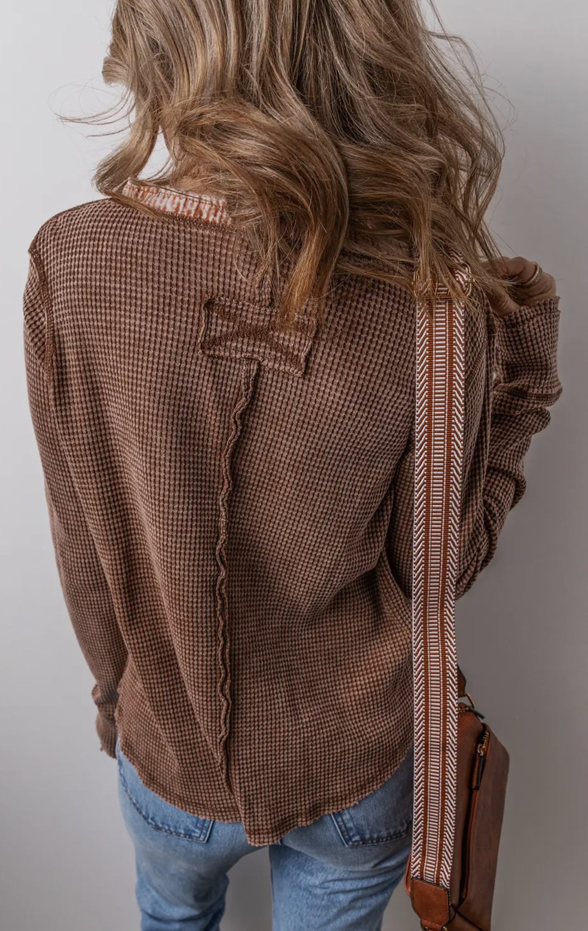 The Acid Wash Waffle Knit Thermal is a playful blend of 65% polyester and 35% cotton in a unique coffee hue. Perfect for lounging or casual wear, this thermal is both comfortable and stylish. Embrace your inner cool with this fun and funky top.