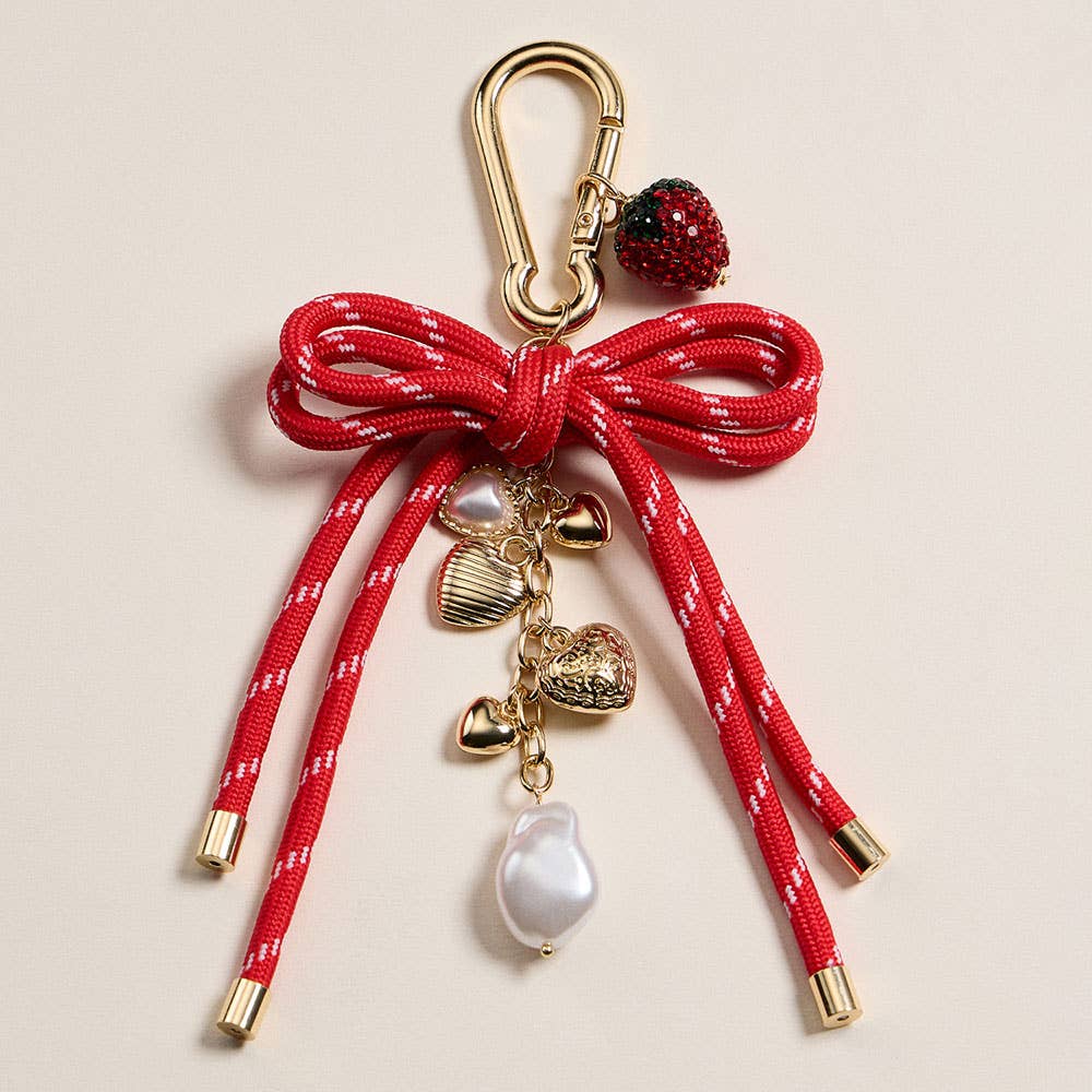 Charming red bow keychain adorned with a glitter strawberry charm, pearl drop, and gold-tone heart accents. Ideal for adding a sweet, playful touch to bags or keys.