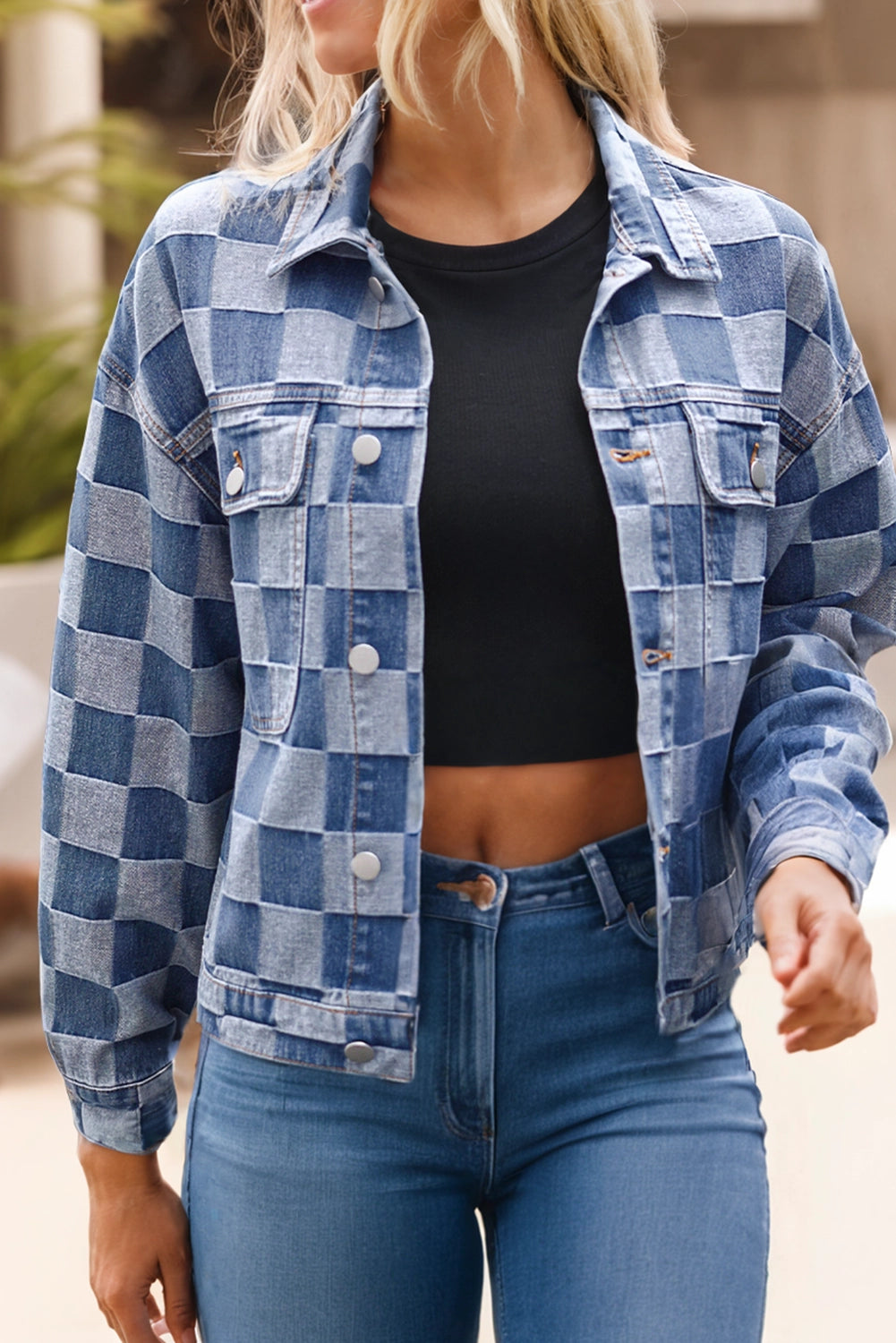 Introducing our Checkered Patchwork Button Up Denim Jacket! This casual and stylish jacket is a must-have for any wardrobe. Made with a comfortable blend of cotton and polyester, it's perfect for daily wear during the pre-fall season. The patchwork pattern adds a playful touch, while the flap pockets and button-up front make it both fashionable and practical. Available in sizes S-XL.