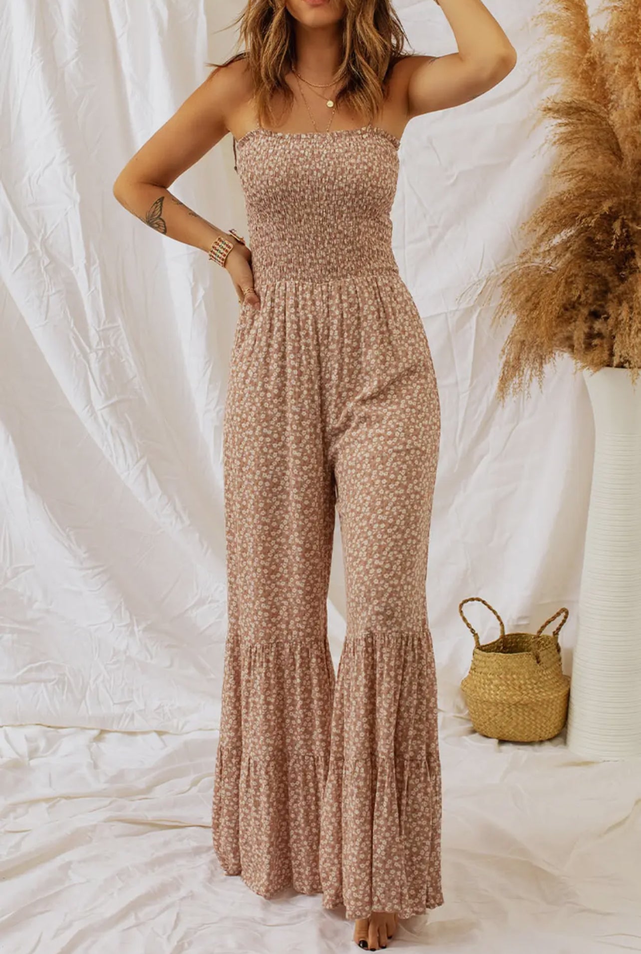 This flirty jumpsuit features a smocked bodice and smooth, non-stretchy polyester fabric for a comfortable and stylish fit. The pants are lined for added coverage. Perfect for a fun and playful look!