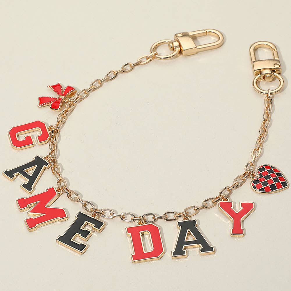 Fun and sporty bag charm featuring "Game Day" letter charms, a mini bow, and a heart accent. Perfect accessory to show team spirit by clipping onto purses, backpacks, or game-day totes.