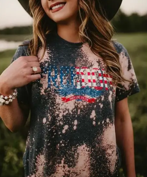 Distressed Tee: Poly/Cotton Blend with bleached distressing giving each one a different look. No two the same!