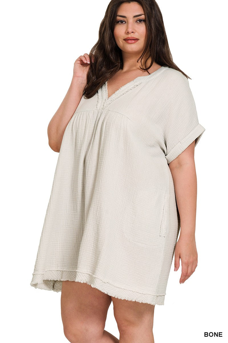 Gauze Raw Edge Cuffed Sleeve Dress