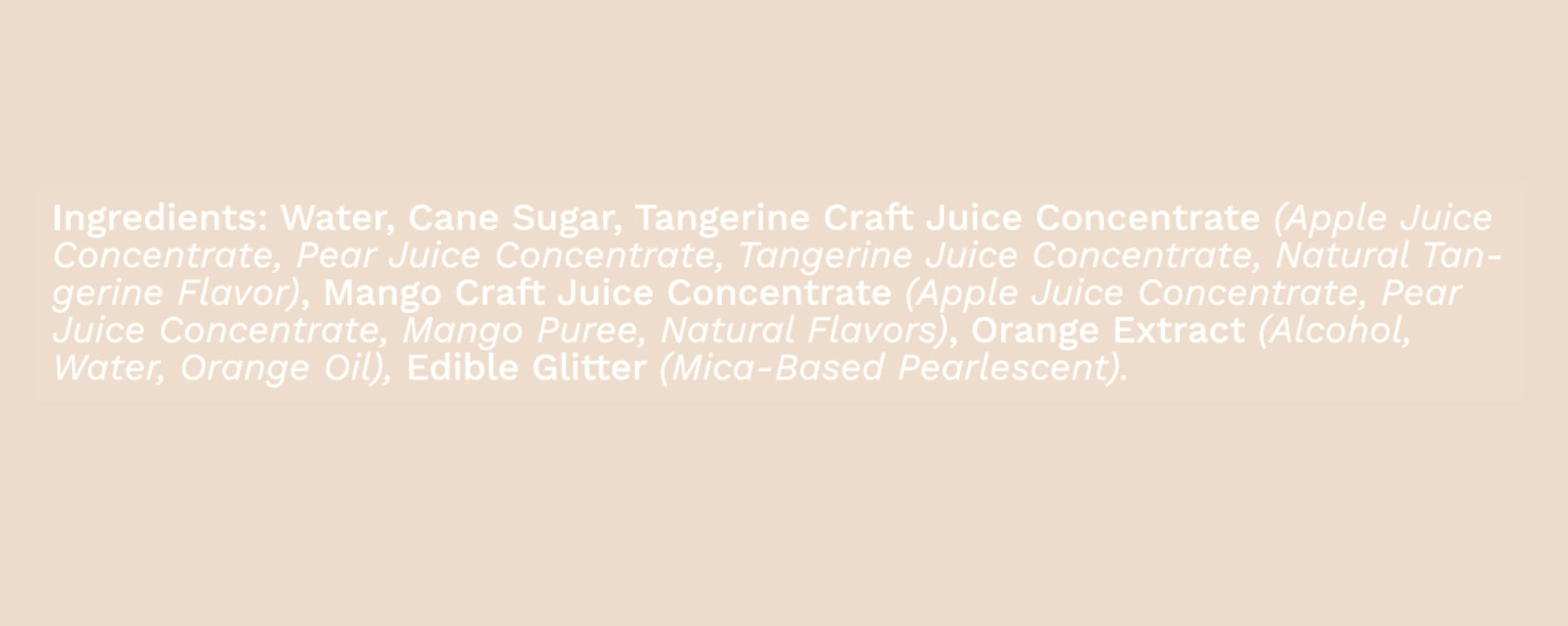 Get your sparkle on with our concentrated, glitter-infused Glitter Mimosa Mixer. It contains tangerine and mango in addition to FDA-approved edible glitter that is made from the mineral mica. There's absolutely zero micro-plastics or anything artificial. Just add 1/2 to 1 ounce of this mixer to a glass of sparkling wine or sparkling juice for a mimosa or "mock-mosa". Or follow our lead and add 1 ounce of this mixer to 1-2 ounces of white rum and a splash of seltzer on top for a fun, tropical cocktail. Each 16 fl oz glass bottle makes 16-32 drinks!