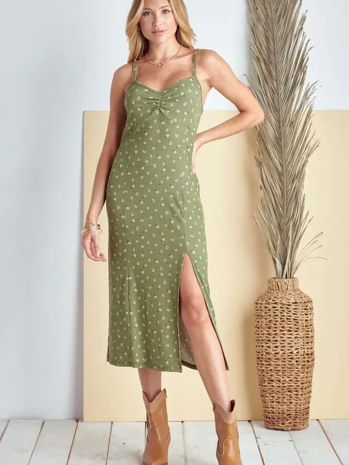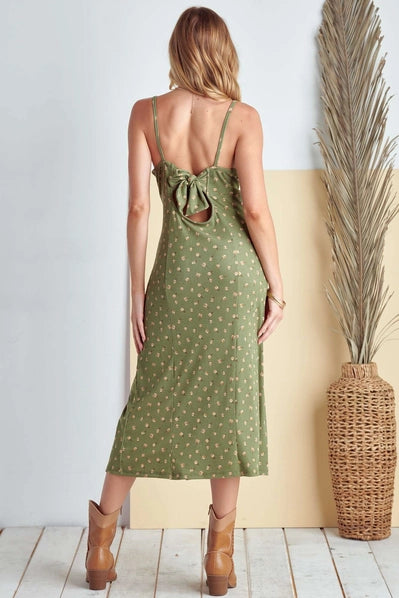 FLORAL PRINT SPAGHETTI STRAP MIDI DRESS WITH FRONT SLIT DETAIL -Tie back closure -Cutout back -Side slit -Good stretch
