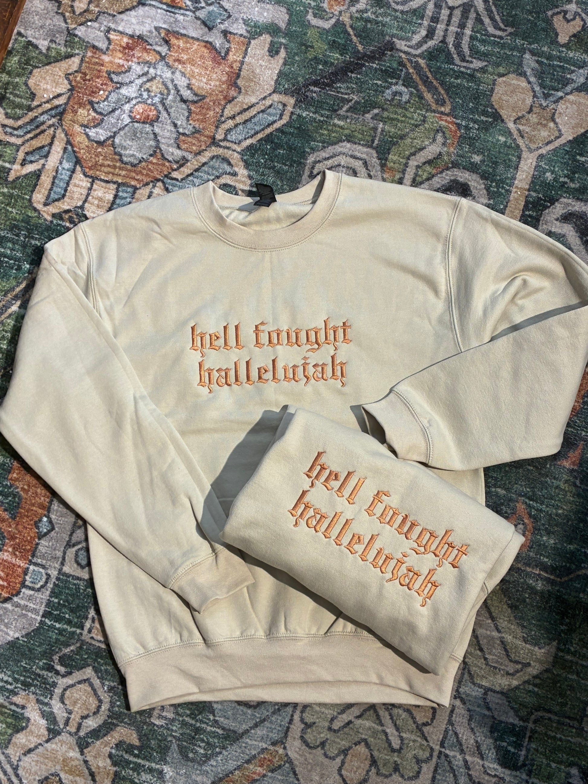 Spread the message of faith with our "Hell Fought Hallelujah" crewneck sweatshirt. Made with embroidered details (color: brown sugar) and long sleeves for added warmth and style, this sweatshirt (color: sand) is a powerful way to share your testimony.