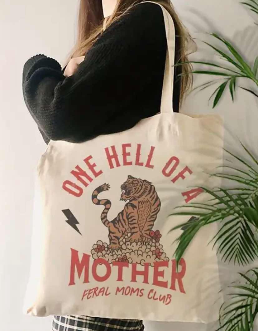 Carry your motherhood pride on your shoulder with our Hell of a Mother Canvas tote. Measures approx 14.75" x 14.2" for the perfect size tote for anything you need to take along on your mom adventures.