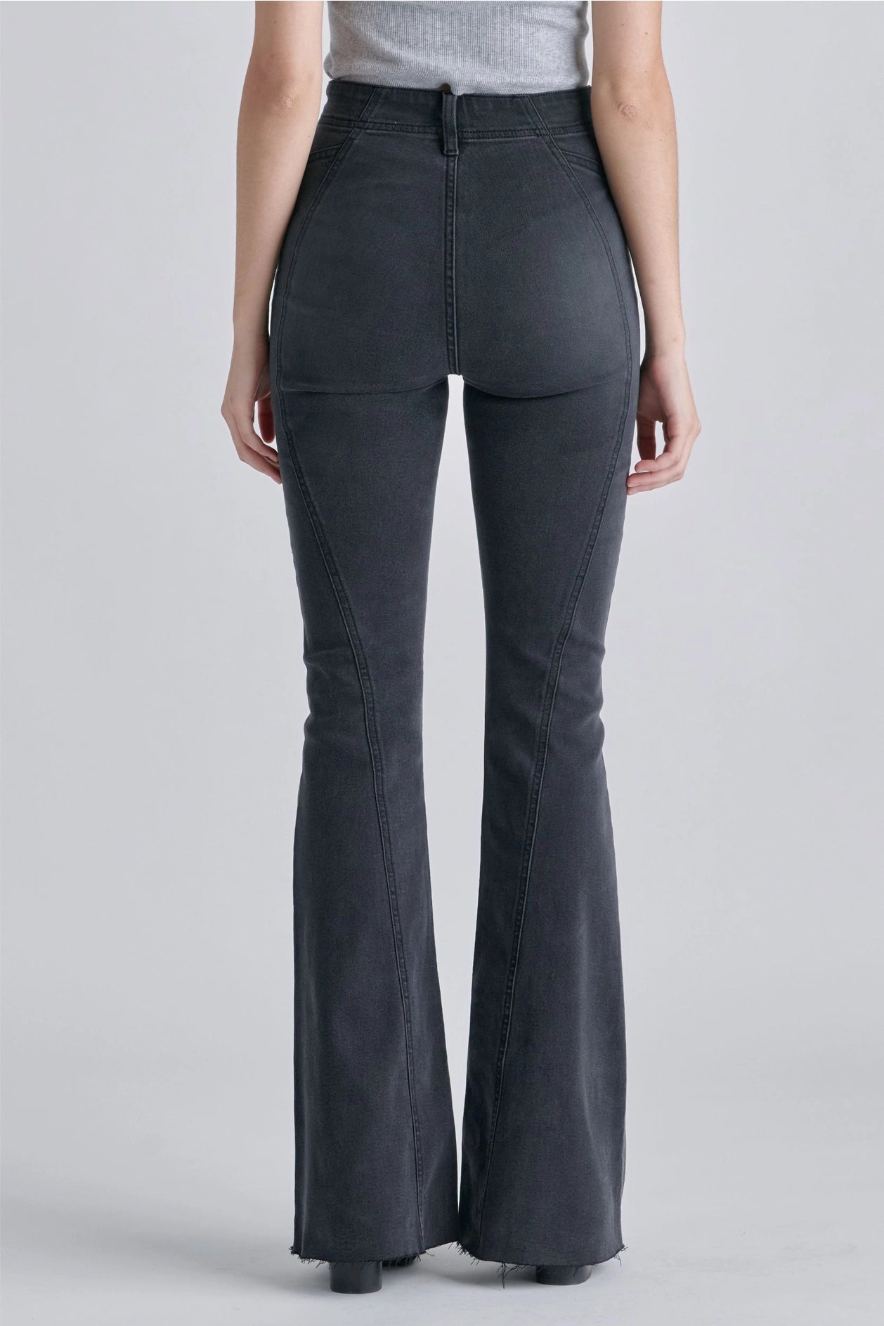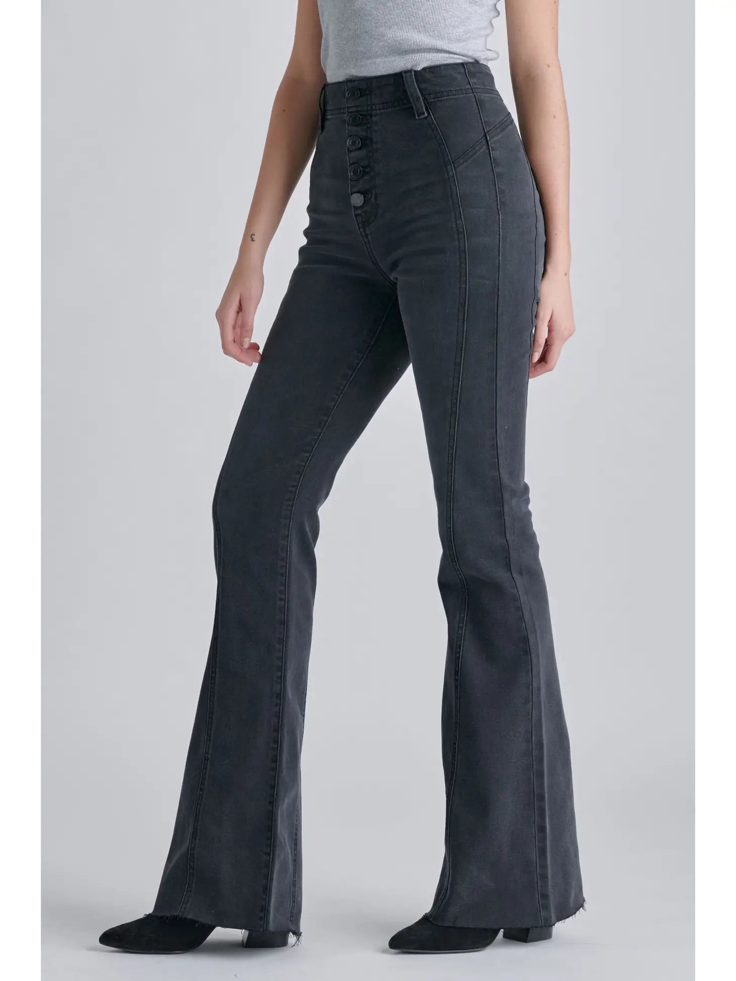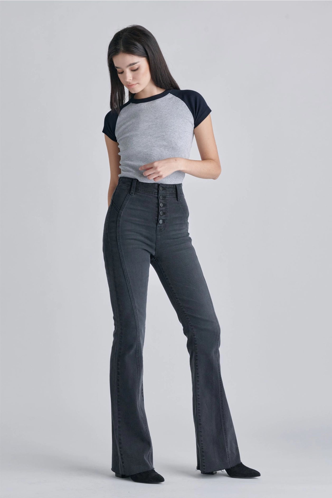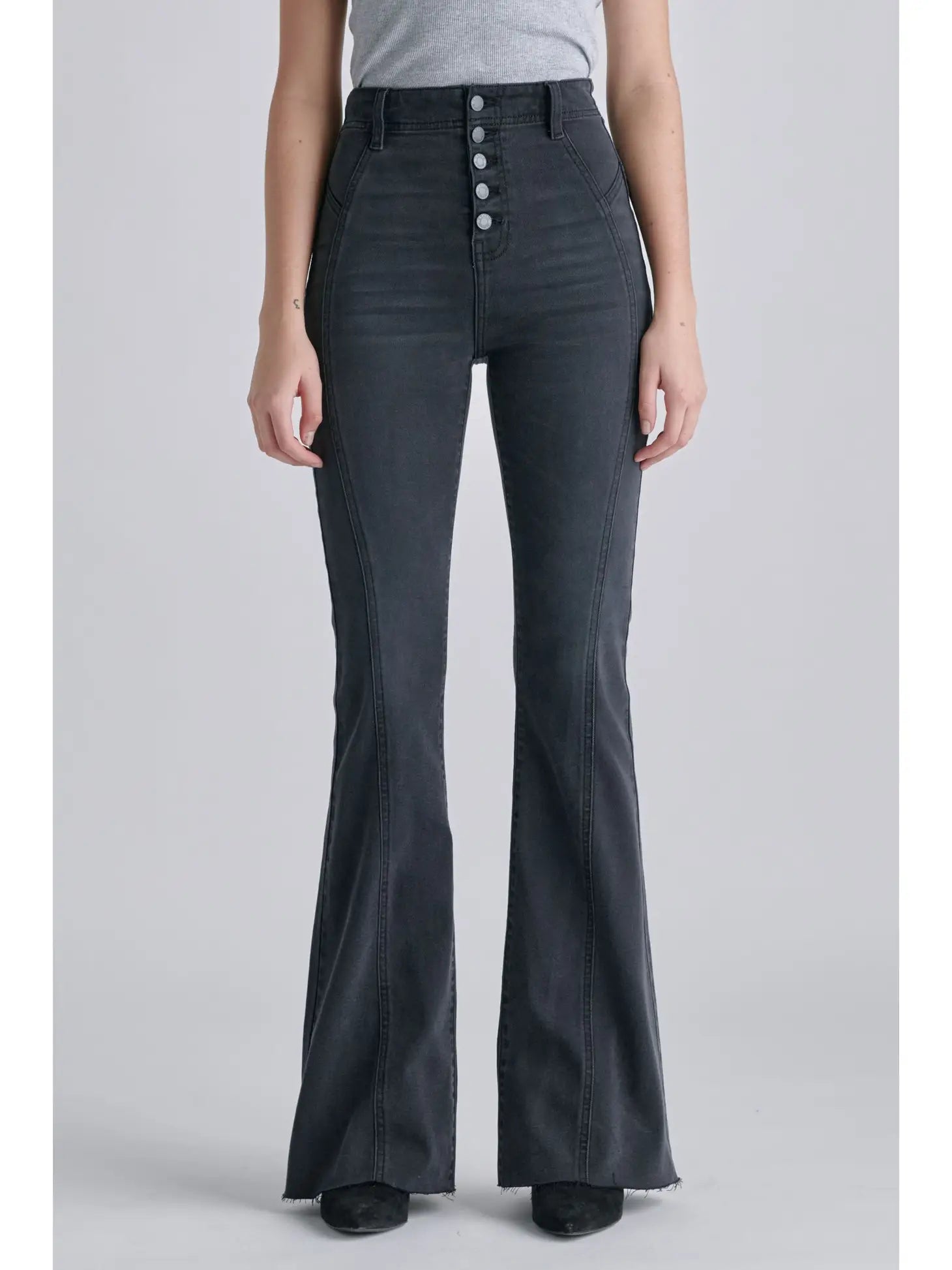 Elevate your style with our on-trend ultra high-rise flared jeans. The full-length fit is slim through the waist and thighs, holding you in at the top while flaring out below the knee. Featuring a dark wash and front/back seam details, finished with a 5-button fly closure. Inseam: 34”, Rise: 11 1/2%.