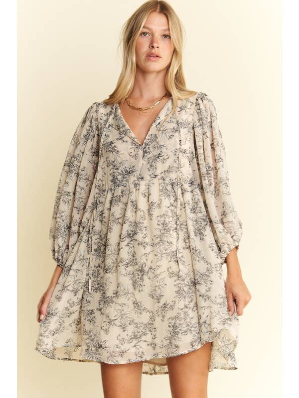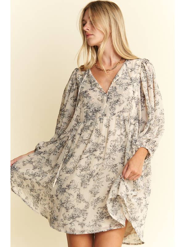 LINED 3/4 SLV FLORAL CHIFFON BABYDOLL SHORT A-LINE DRESS - Lined with Short Dress - Front Tie around Neckline - Loose fit - V neck - 3/4" sleeve