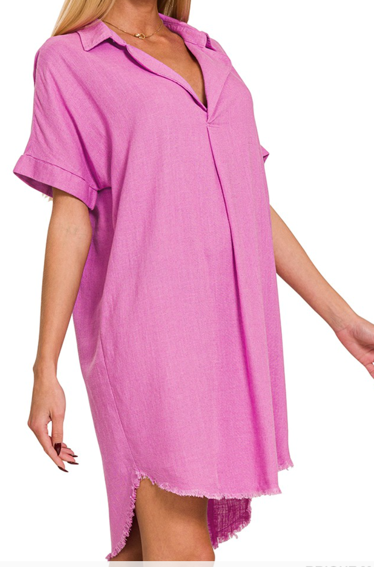 This bright pink linen shirt dress is perfect for a casual yet stylish look. The frayed hem adds a touch of edge to the classic shirt dress design. Made from high-quality linen, this dress is comfortable and versatile, suitable for any occasion.