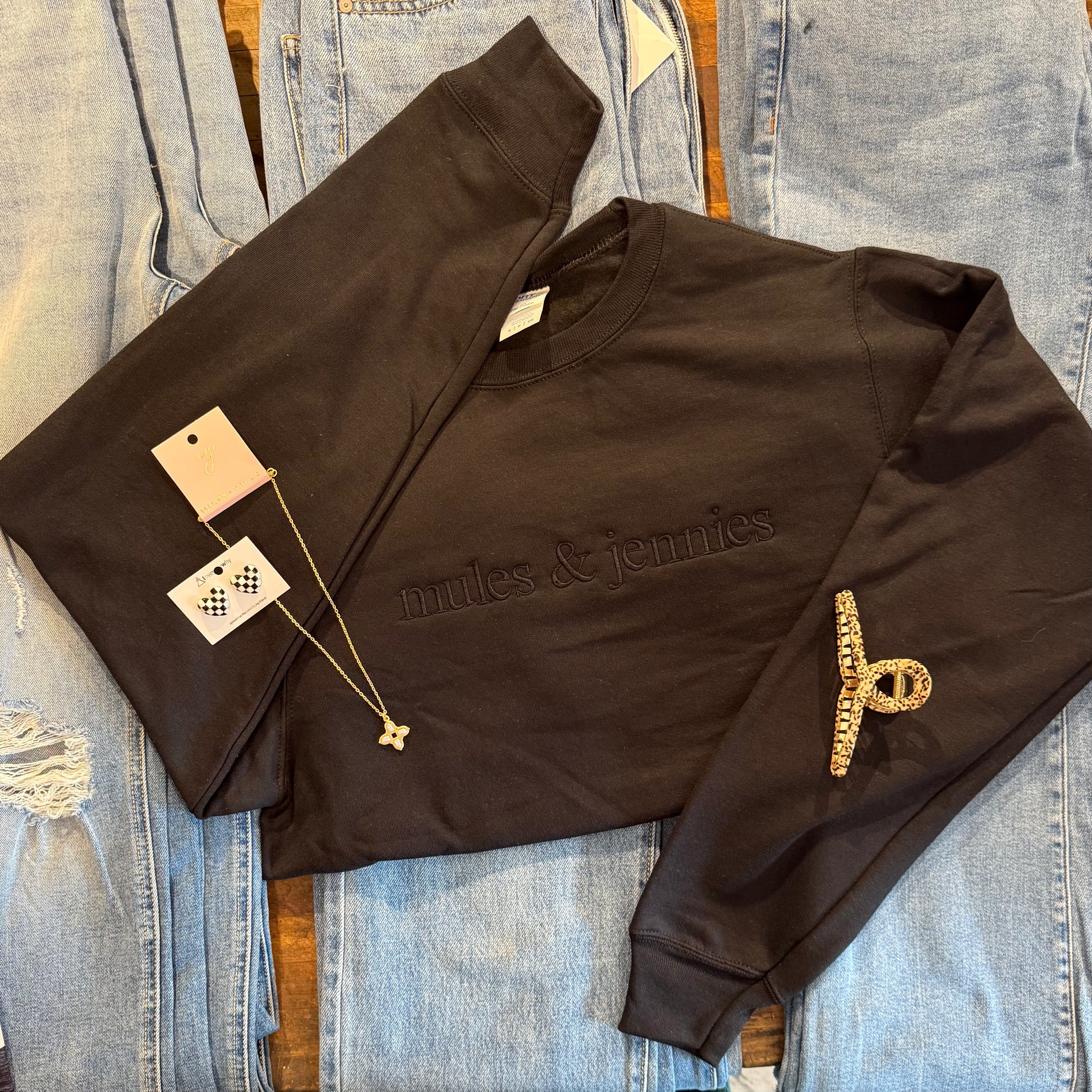 Show off your college pride with our Mules & Jennies Embroidered Sweatshirt! Featuring elegant embroidery in monochromatic black on black, this sweatshirt is perfect for any fan of the University of Central Missouri. Stay cozy and stylish with this unique piece. Go Mules & Jennies!