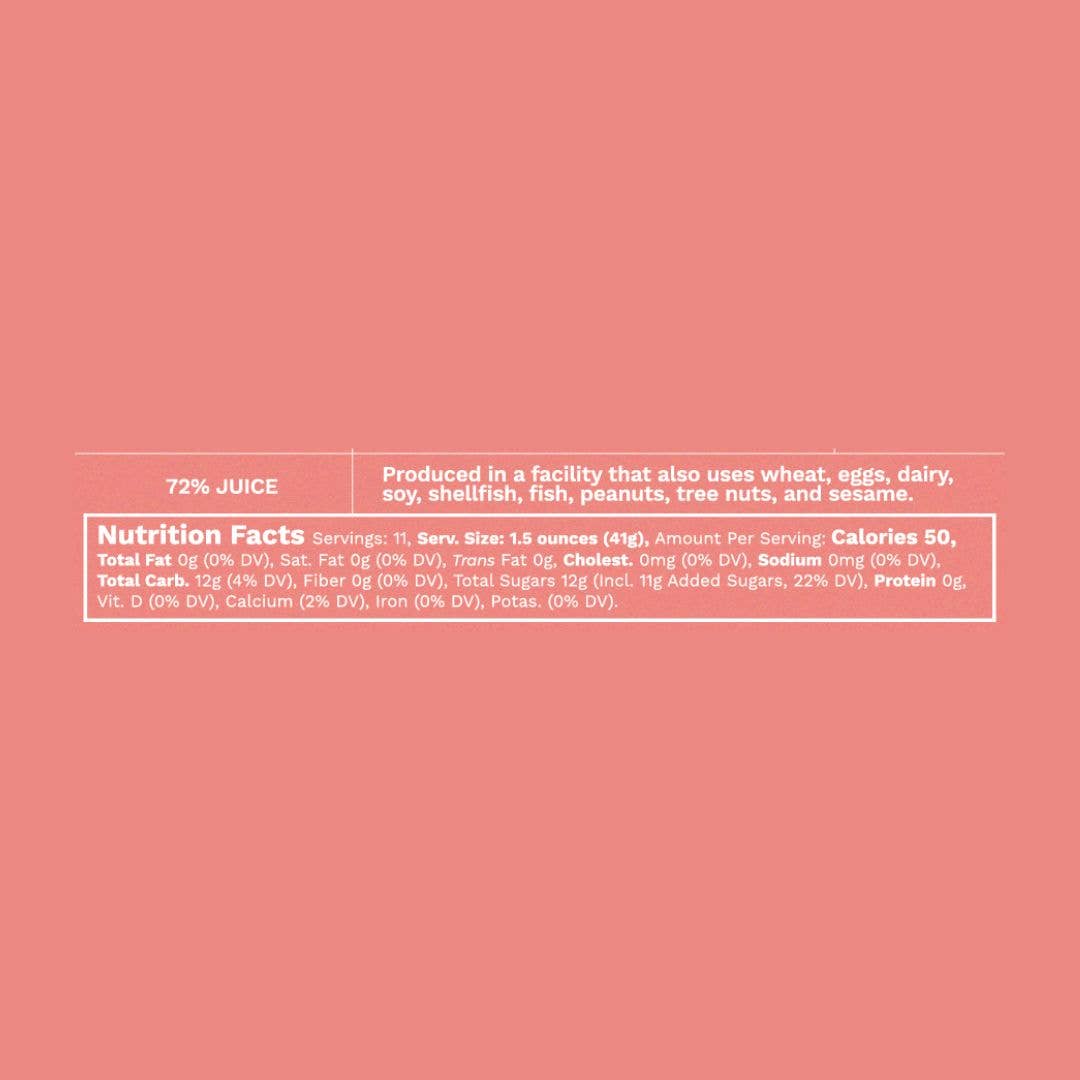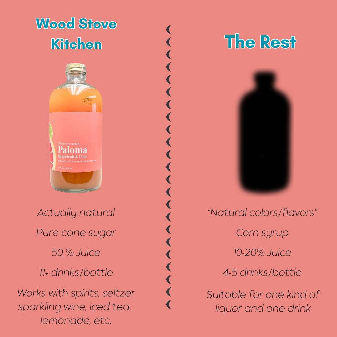 Bright, tart grapefruit combines with fresh lime to make an incredible mixer with a bright pink color that just pops in any glass. This mixer makes it quick and easy to make one of the most popular summer-time cocktails, the Paloma. Just add 1.5-2 ounces of this natural mixer to tequila or mezcal and seltzer. It's as easy as that! The bold flavors shine through whether you're making a cocktail or a non-alcoholic mocktail. Each 16 fl oz glass bottle of this highly concentrated mixer will make up to 11 drinks. Ingredients: Water, Cane Sugar, Grapefruit Juice Concentrate, Lime Juice Concentrate, Agave. Shelf life: 24 months.