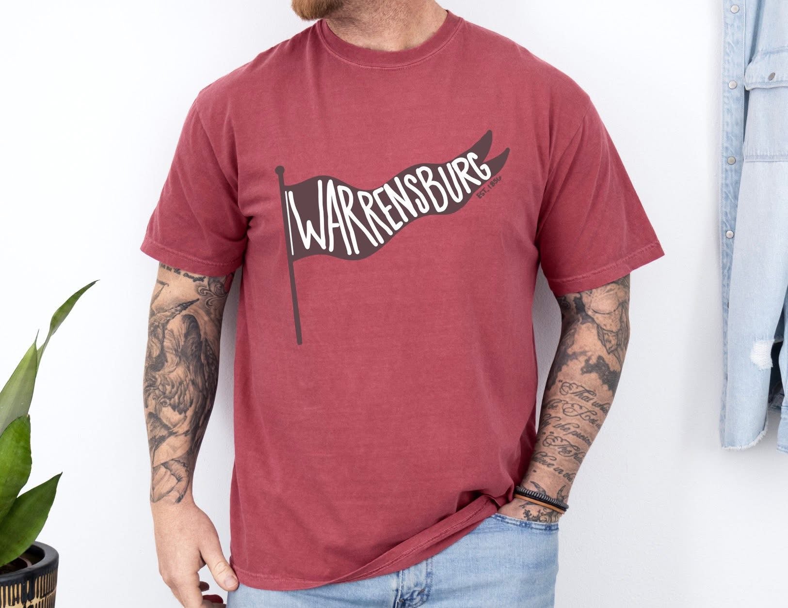 This custom flag design proudly represents Warrensburg, Missouri - where small town charm meets big heart energy. Show off your love for this unique community with this retro inspired design. Sweatshirts are printed on Gildan, which run true to size. We recommend sizing up for an oversized fit! The T-shirts are printed on Comfort Colors which is known for its more oversized look.