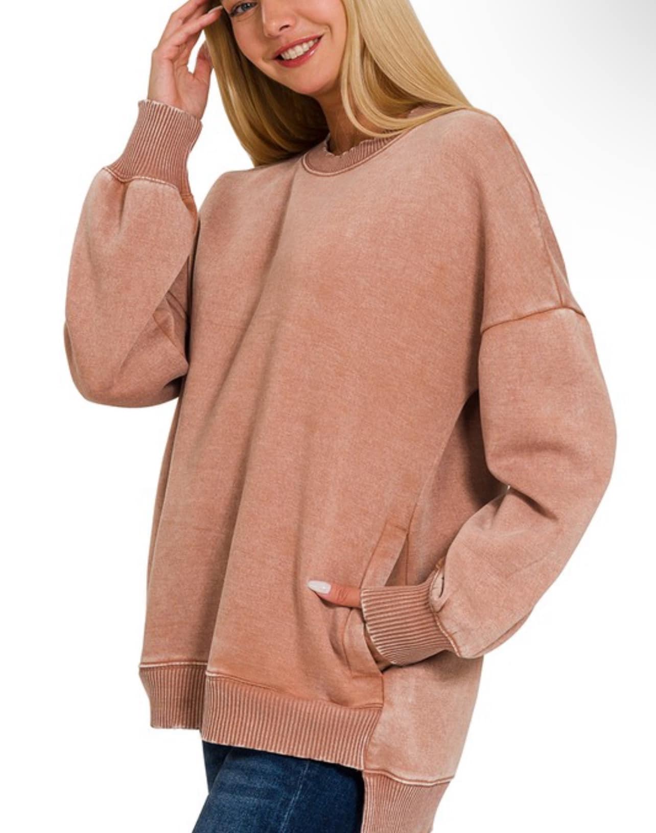 Acid Wash Fleece pullover with a hi-low hem and pockets. Each item is unique in color variation due to the dye process. Oversized fit.