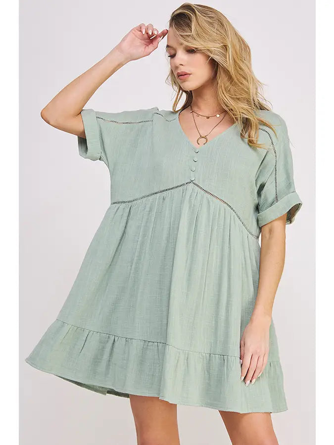 TEXTURED SHORT SLV BUTTON DOWN V-NECK SHORT DRESS - Lining Included - 2 Side Hip Pockets - Ladder Trim Detail - Flowy A-Line Body - V-Neckline - Textured Woven Fabric