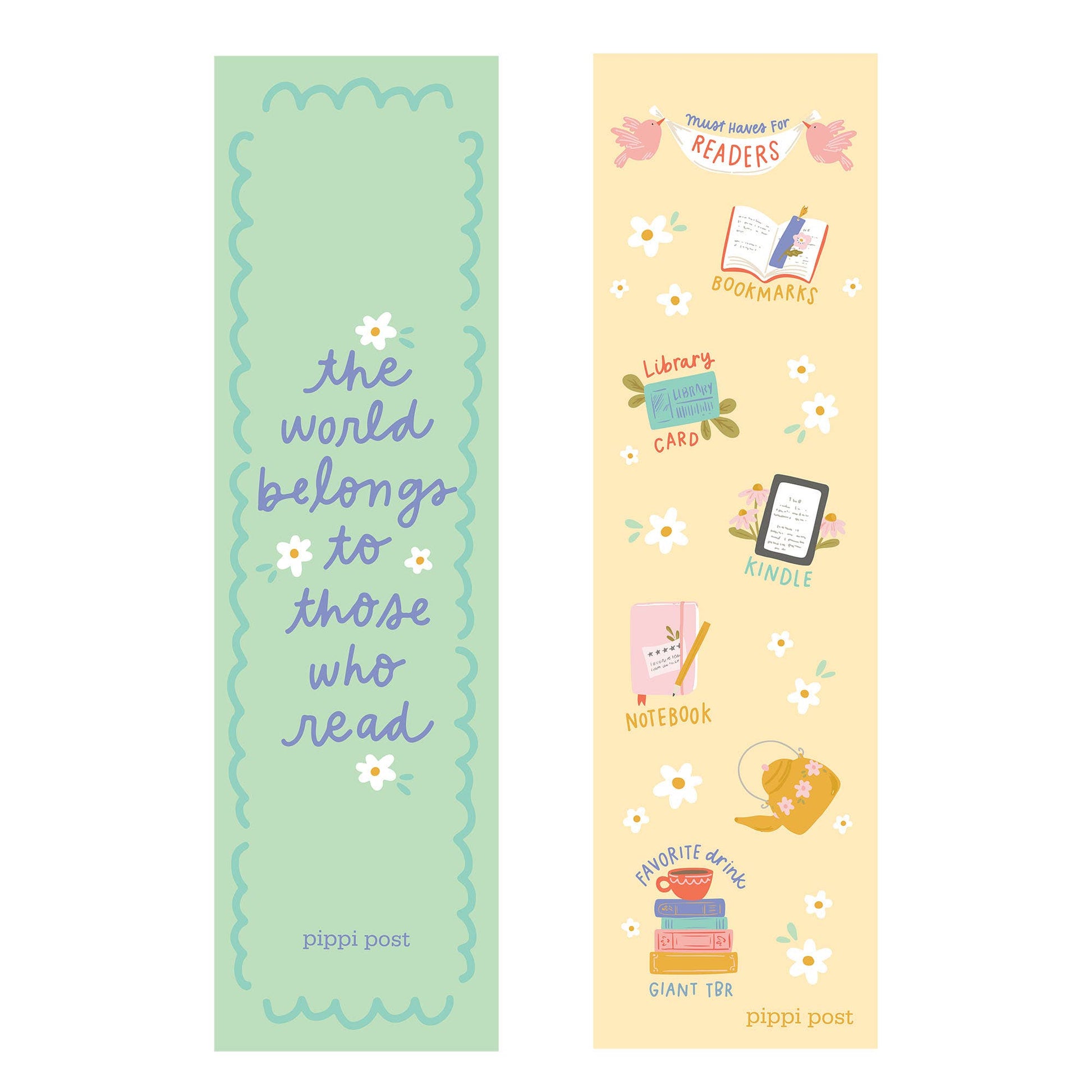 One bookmark features the inspiring phrase “The world belongs to those who read,” while the other lists must-haves for every reader: bookmarks, library card, Kindle, notebook, favorite drink, and a giant TBR pile.