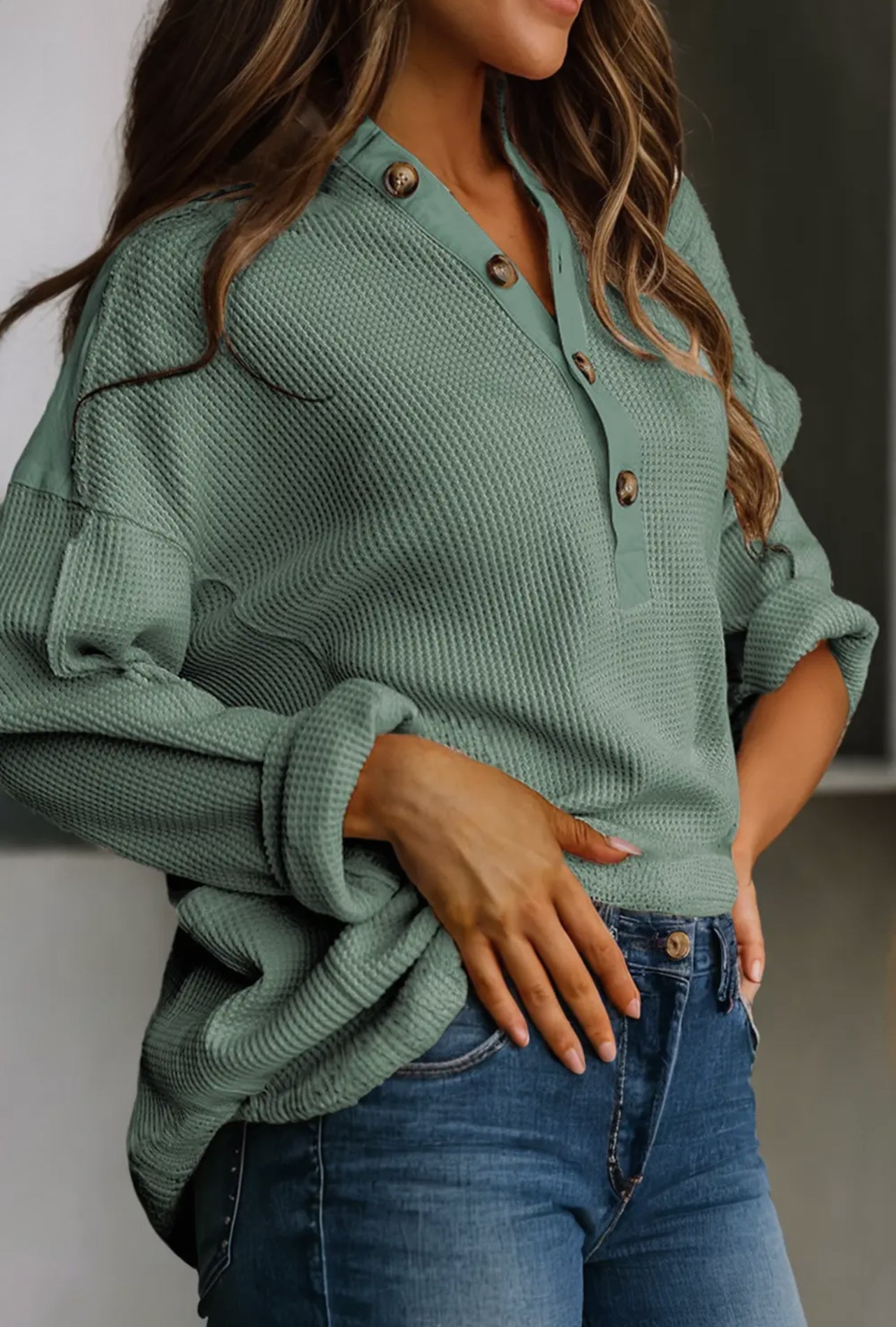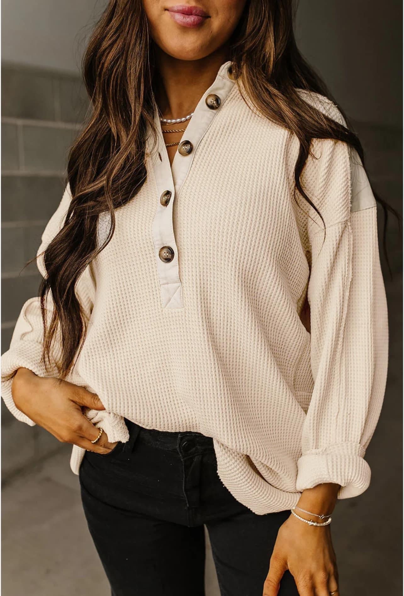 Get cozy with our Waffle Oversized Long Sleeve Top! Made with a 75% polyester and 25% cotton blend, this top features a waffle knit design and a half button closure. Perfect for those chilly days, this top combines comfort and style effortlessly.