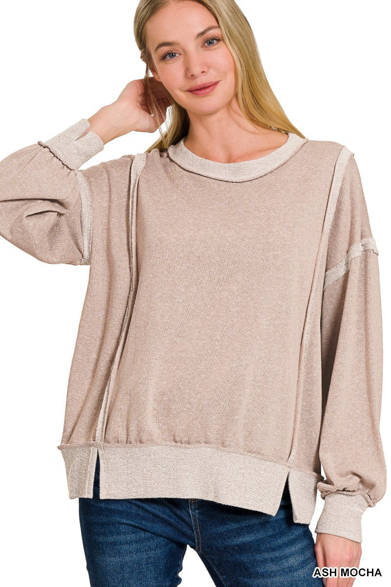 Washed pullover with exposed seam and split bottom band. 100% Cotton French Terry.