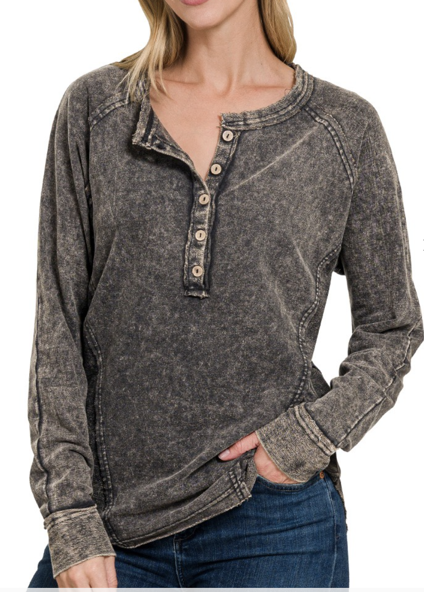 This long-sleeve top is has a washed finish and raw hem. It features a back patch, seam details, and a button henley neckline.