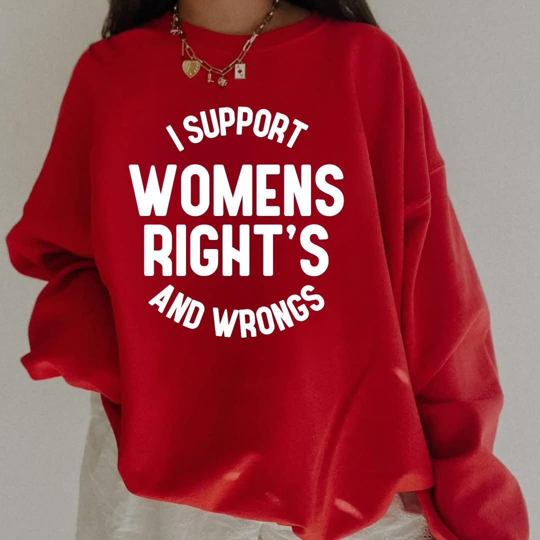 Make a stand for equality with the Women's Rights Sweatshirt. This Gildan sweatshirt, in bold red with white font, proudly proclaims "I support women's rights and wrongs." True to size, or size up for an oversized fit. Take a stance in comfort and style!